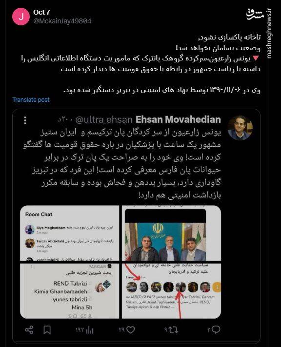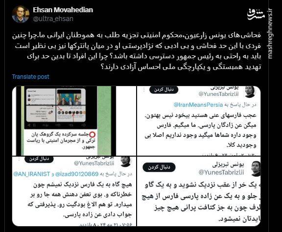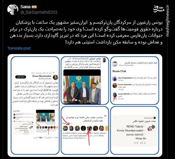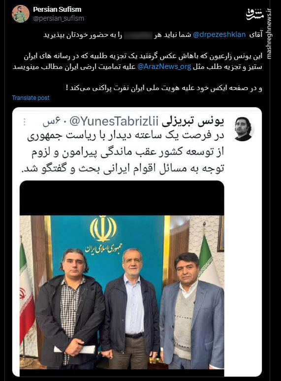 نکته جالب آنکه در حالی که در پست مشترک این هفت نفر درباره دیدار با مسعود پزشکیان گفته شده جلسه درباره امکانات رفاهی و بهبود مسیرهای ارتباطی تبریز برگزار شده است، اما یونس زارعیون که در سالهای اخیر مشغول اهانت به اقوام ایرانی بود، پس از دیدار با رئیس جمهور نیز دست از اختلافافکنی بین اقوام بر نداشته و مدعی شده در جلسه با آقای پزشکیان درباره هورالعظیم، اعراب و چین گفتگو کرده است!