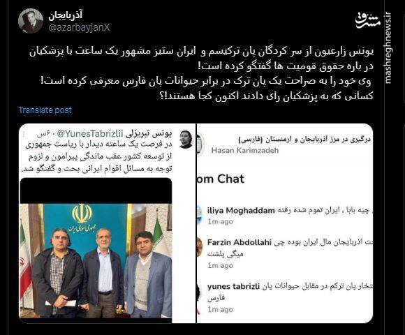 منصور حقیقتپور، نماینده پیشین مجلس و از چهرههای سیاسی نزدیک به رئیسجمهور در شبکه اجتماعی ایکس و با هشتک تجزیه طلب درباره این دیدار نوشت: آقای پزشکیان، یونس تبریزلی را میشناسید؟ که با ایشان جلسه تشکیل میدهید، اگر میشناسید واقعا برای شما متاسفم اگر نمیشناسید کسانی که در دفتر شما این جلسه را تشکیل دادند را عزل کنید!