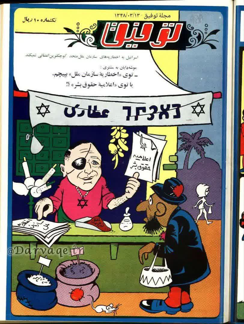 به گزارش شهدای ایران: کشک بودن قوانین بینالمللی برای اسرائیل به روایت مطبوعات قبل از انقلاب/ پیروی رژیمصهیونیستی از قانون جنگل و بیتوجهی به قوانین جامعه جهانی و سازمانهای حقوق بشری، تصویر روی جلد مجله فکاهی توفیق./ سال ۱۳۴۸ش