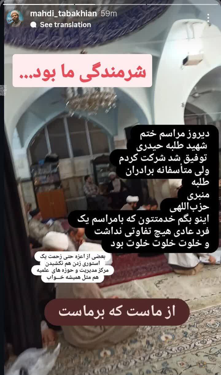 اکنون در ظهر روز دوشنبه، فضای مسجد بقیهالله اعظم حال و هوایی متفاوت دارد. بر دیوارهای مسجد، اعلامیههایی از مراسم ختم حجتالاسلام حیدری نصب شده و در ورودی، بنری بزرگ از سوی اهالی محل نصب دیده میشود که در آن شهادت مظلومانه این روحانی را تسلیت و تبریک گفتهاند.