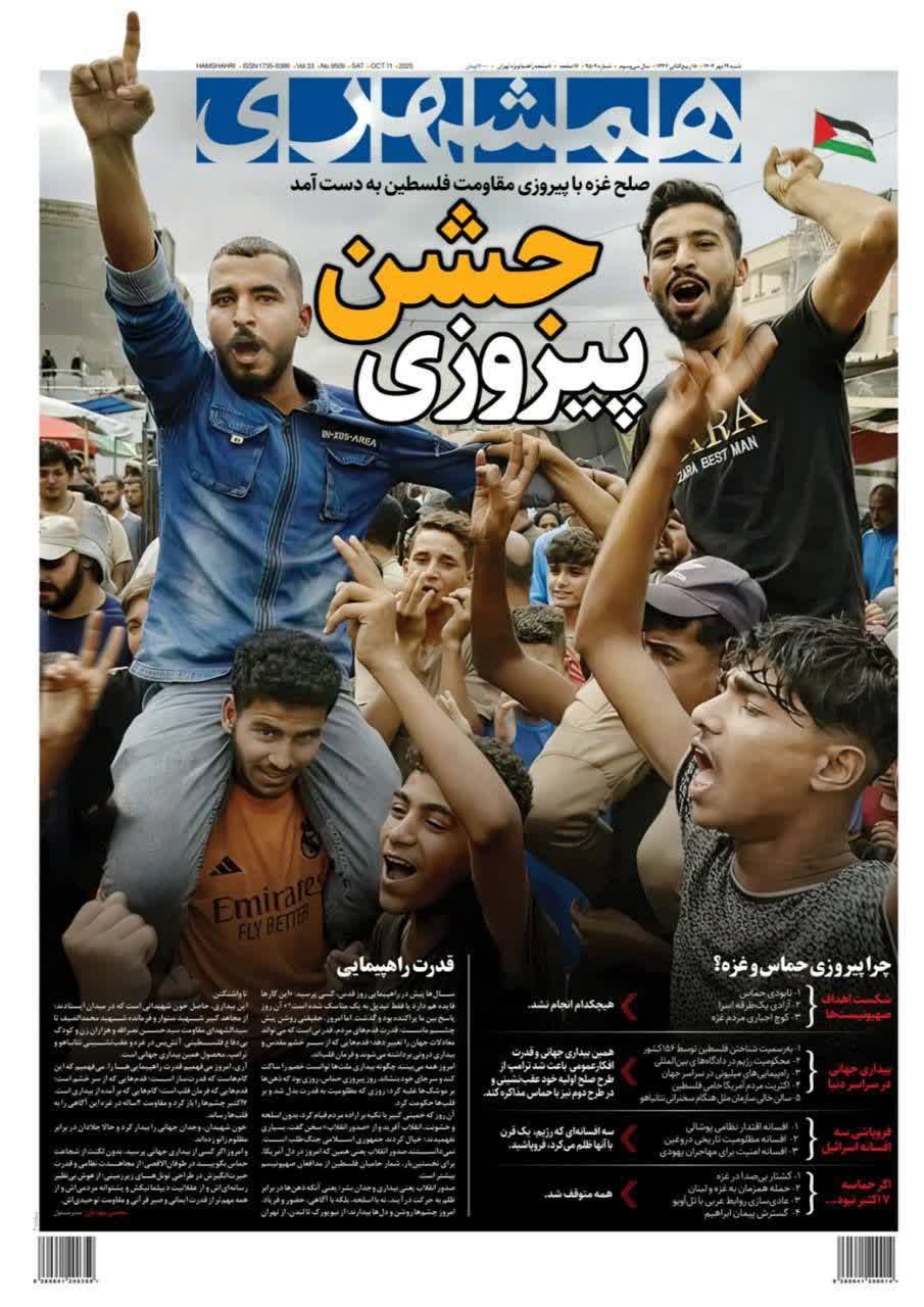 به گزارش شهدای ایران: تیتر صفحه نخست روزنامه همشهری؛ صلح غزه با پیروزی مقاومت فلسطین بدست آمد.