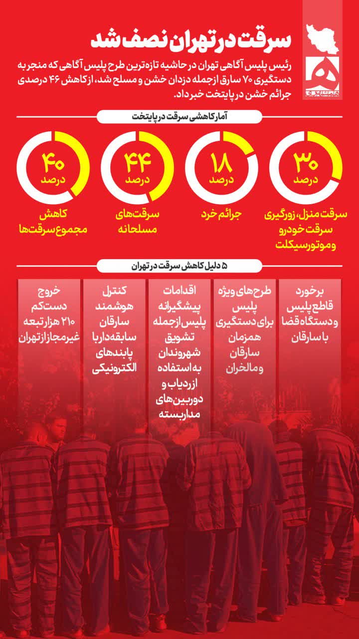 به گزارش شهدای ایران: رئیس پلیس آگاهی تهران در حاشیه تازهترین طرح پلیس آگاهی که منجر به دستگیری ۷۰ سارق ازجمله دزدان خشن و مسلح شد، از کاهش ۴۶ درصدی جرائم خشن در پایتخت خبر داد.