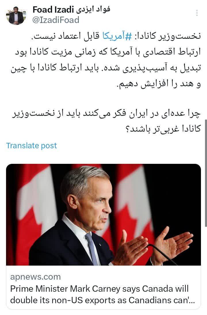 به گزارش شهدای ایران: فواد ایزدی کارشناس ارشد مسائل آمریکا در صفحه شخصی خود در ایکس نوشت: یک عده فکر میکنند باید از نخست وزیر کانادا غربیتر باشند.