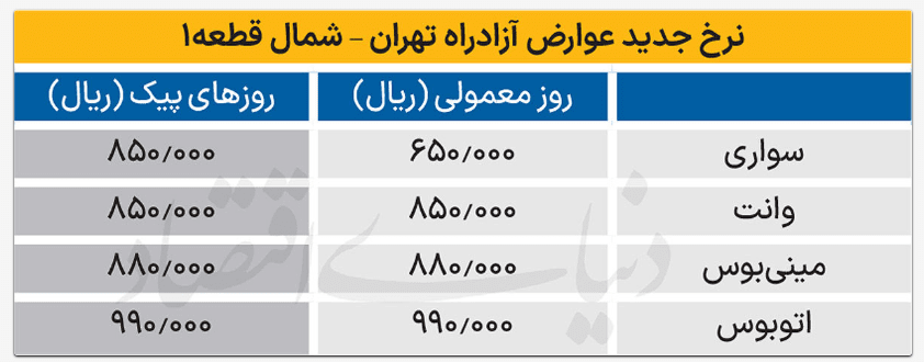 همچنین، نرخ عوارض در روزهای پیک و پایان هفته از ۶۵ به ۸۵ هزار تومان افزایش یافته است. به گفته دوستی، نرخ عوارض در تونل البرز نیز از ۳۹ هزار تومان در روزهای عادی به ۵۰ هزار تومان و در روزهای پیک از ۶۵ هزار تومان به ۸۵ هزار تومان رسیده است. همچنین نرخ عوارض عبور از قطعه چهار آزادراه تهران - شمال از ۱۶ هزار و ۵۰۰ تومان به ۲۳ هزار تومان رسیده است. به گزارش «دنیای اقتصاد»، آخرین بار آبان ماه سال گذشته بود که نرخ عوارض پنج آزادراه دولتی با تصمیم شورای اقتصاد افزایش یافت.