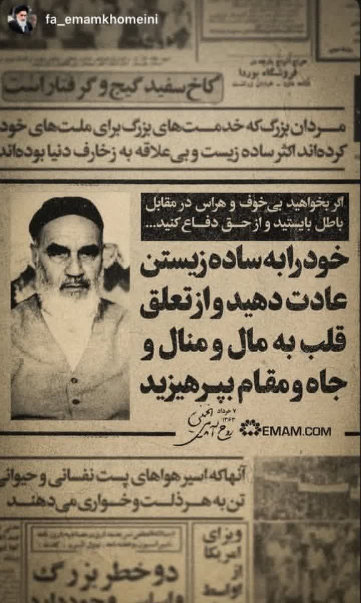 به گزارش شهدای ایران: امام خمینی(ره) می‌فرمایند: اگر بخواهید بی‌خوف و هراس در مقابل باطل بایستید و از حق دفاع کنید و ابرقدرتان و سلاحهای پیشرفته آنان و شیاطین و توطئه‌های آنان در روح شما اثر نگذارد و شما را از میدان به در نکند، خود را به ساده زیستن عادت دهید و از تعلق قلب به مال و منال و جاه و مقام بپرهیزید.