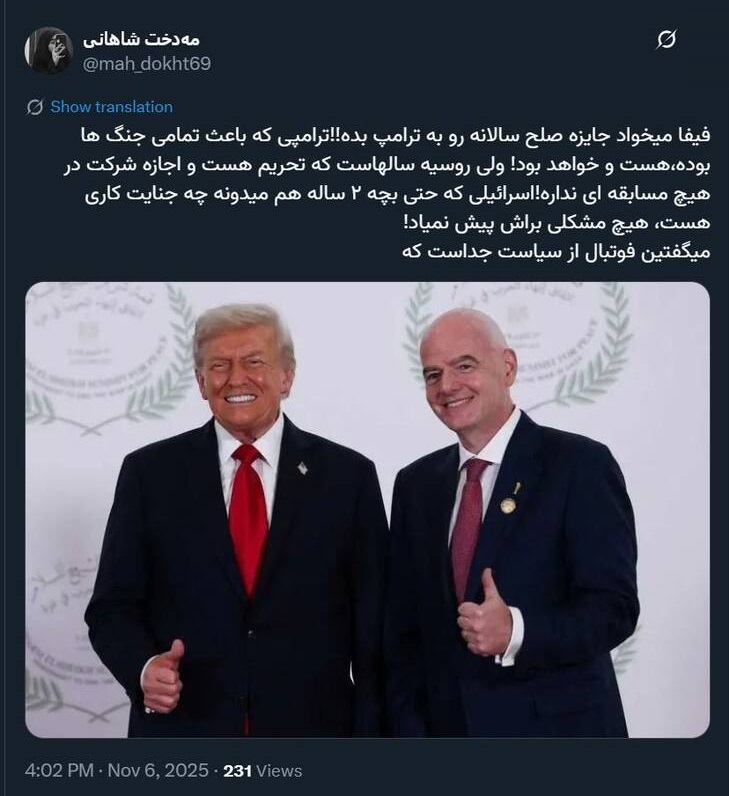 به گزارش شهدای ایران: فیفا میخواد جایزه صلح سالانه رو به ترامپ بده!!ترامپی که باعث تمامی جنگ ها بوده،هست و خواهد بود! ولی روسیه سالهاست که تحریم هست و اجازه شرکت در هیچ مسابقه ای نداره!اسرائیلی که حتی بچه ۲ ساله هم میدونه چه جنایت کاری هست، هیچ مشکلی براش پیش نمیاد!