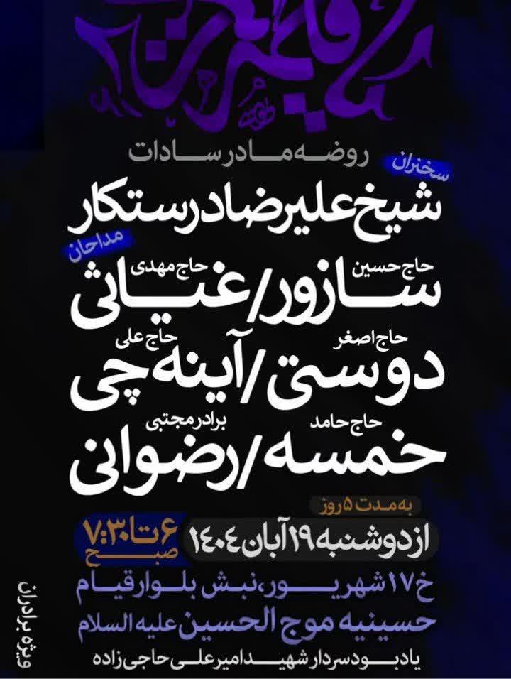 به گزارش شهدای ایران: مراسم شهادت حضرت زهرا(س) و یادبود سردار شهید امیرعلی حاجی‌زاده به مدت پنج روز در حسینیه موج الحسین(ع) برگزار می شود.