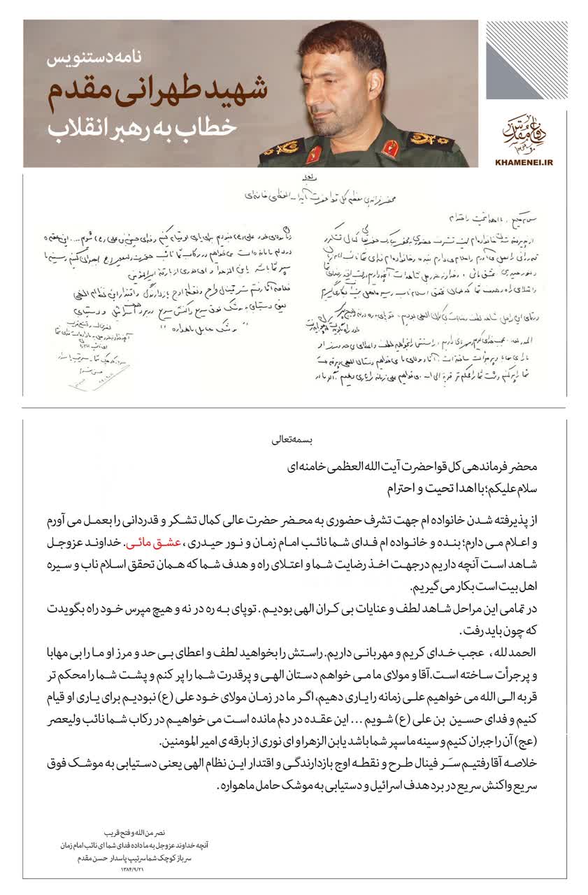 به گزارش شهدای ایران: تصویری از نامه دستنویس شهید حاج حسن مقدم در سال ۱۳۸۴ خطاب به رهبر معظم انقلاب: آقا رفتیم سَر فینال طرح و نقطه اوج بازدارندگی یعنی دستیابی به موشک واکنش سریع در برد هدف اسرائیل