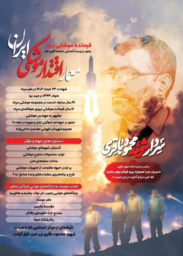 سردار شهید محمود باقری؛ او متولد ۵ تیر ماه ۱۳۴۴ در میبد یزد بود و تمام ۴۱ سال سابقه خدمت خود را منحصراً در مجموعه موشکی نیروی هوافضای سپاه سپری کردند و در سطوح مختلف فرماندهی موشکی، مسئولیتهای کلیدی نظیر واحدهای نقشهبرداری، مهندسی و اطلاعات را بر عهده داشت.