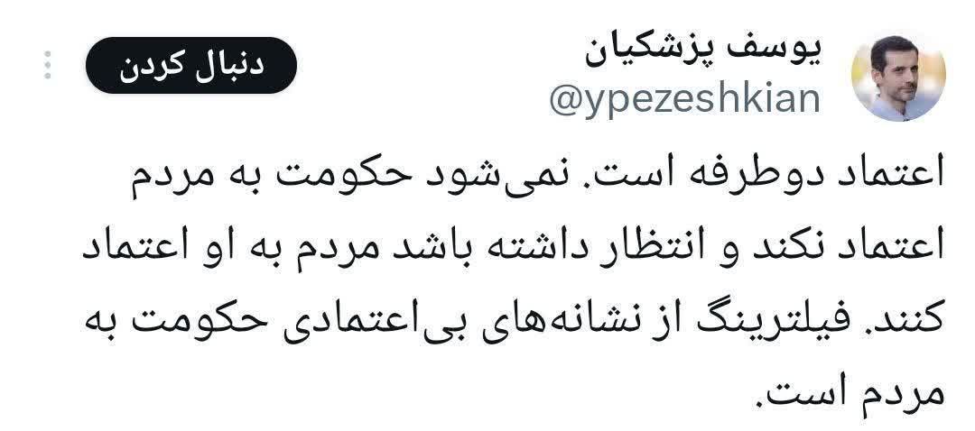 به گزارش شهدای ایران ، یوسف پزشکیان، فرزند رئیس جمهور در صفحه ایکس خود نوشت: «‏اعتماد دو‌طرفه است. نمی‌شود حکومت به مردم اعتماد نکند و انتظار داشته باشد مردم به او اعتماد کنند. فیلترینگ از نشانه‌های بی‌اعتمادی حکومت به مردم است.»