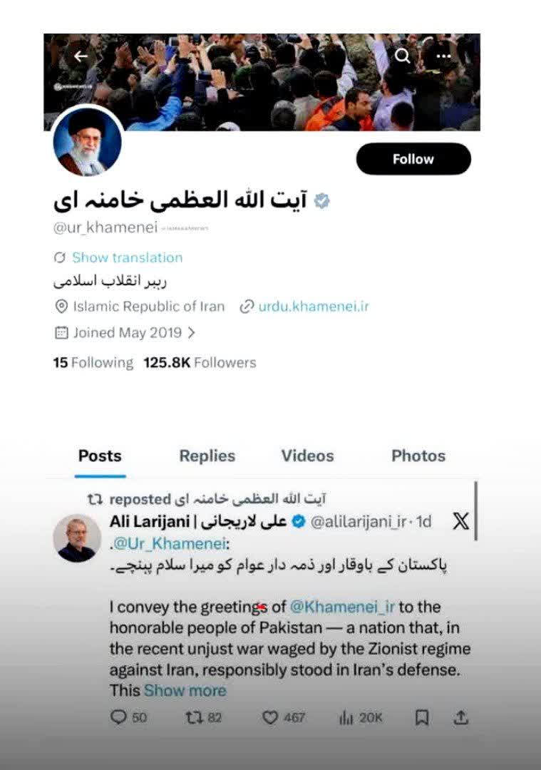 صفحۀ رسمی دفتر رهبری به زبان اردو، توئیت ابلاغ سلام رهبری توسط دکتر علی لاریجانی، دبیر شورای عالی امنیت ملی را بازنشر کرد.