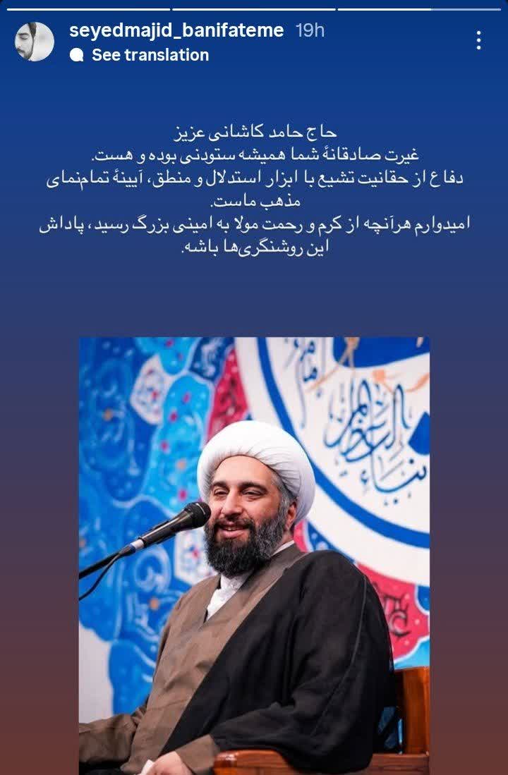 به گزارش شهدای ایران: سید مجید بنی فاطمه مداح اهل بیت(ع) در استوری به صحبت های حامد کاشانی در مناظره با سلیمانی اردستانی واکنش نشان داده است.