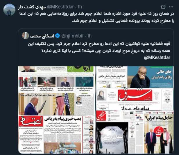 به گزارش شهدای ایران: مدیرعامل خبرگزاری قوه قضاییه در توئیتی از اعلام جرم علیه برخی روزنامههای اصلاحطلب خبر داد