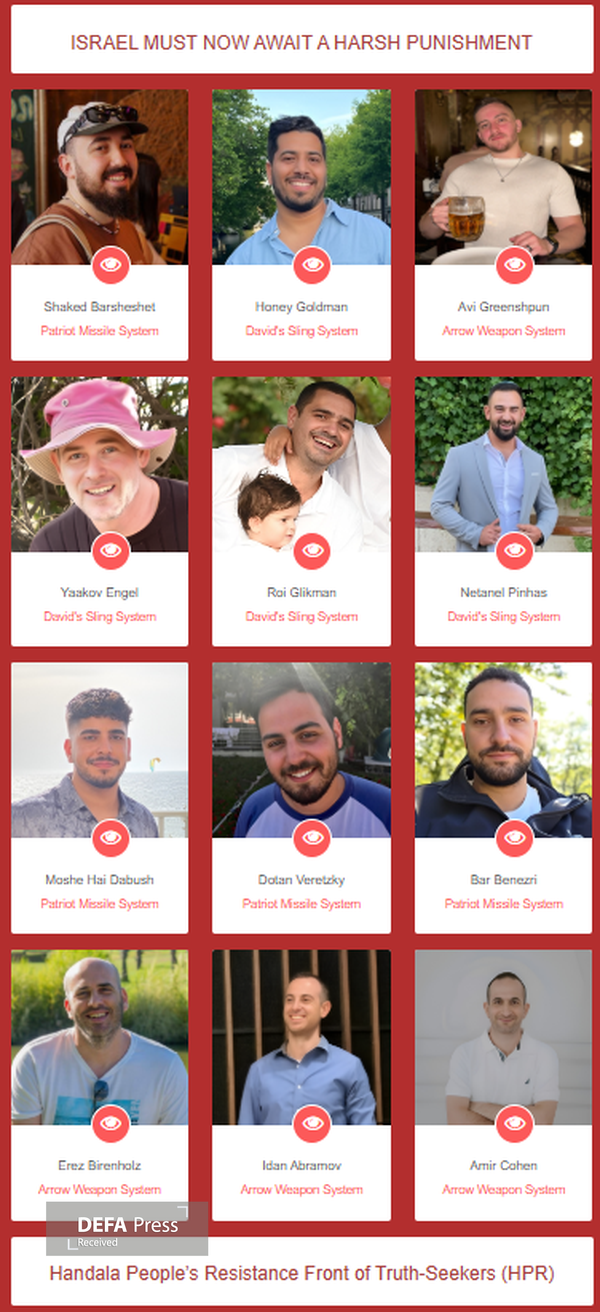 براساس اعلام حنظله اطلاعات ۱۳ نفر از طراحان اصلی سامانههای پدافندی «پیکان» و «فلاخن داوود» افشا شد.