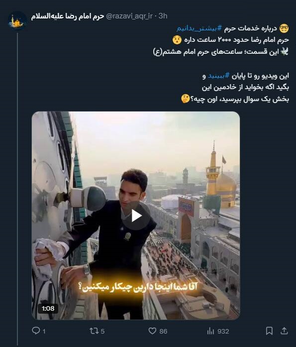 به گزارش شهدای ایران: حساب توئیتر حرم امام رضا علیه السلام نوشت: حرم امام رضا حدود ۲۰۰۰ ساعت دارد.