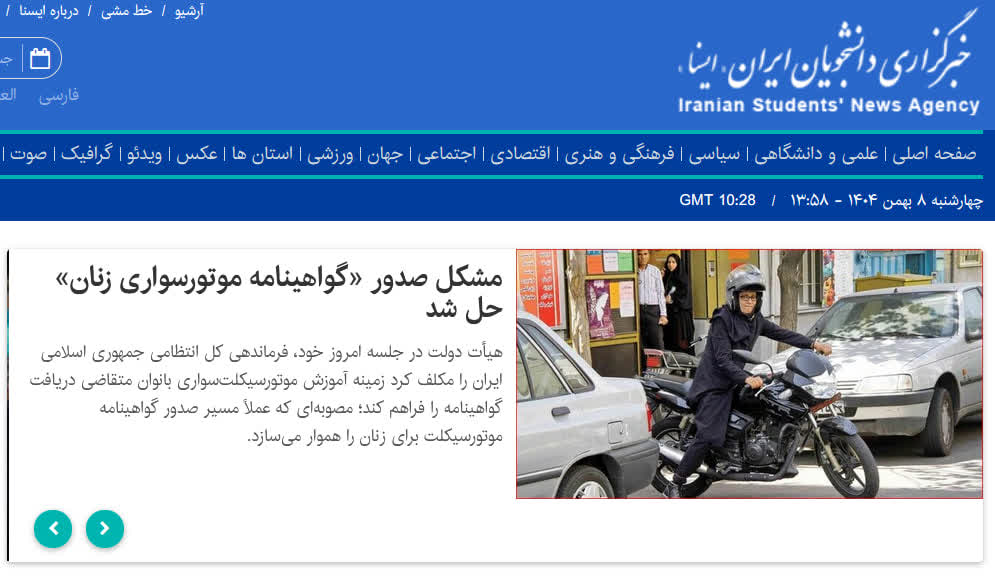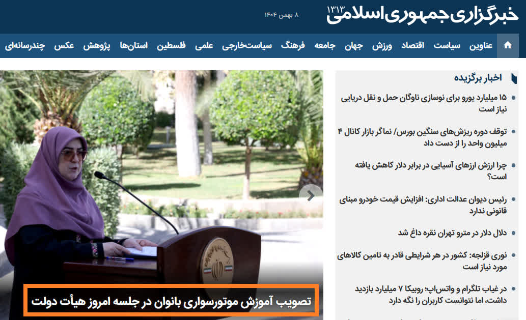 به گزارش شهدای ایران ، تیتر یک خبرگزاری های دولت (ایرنا و ایسنا) از جلسه امروز کابینه «تصویب آموزش موتورسواری بانوان در جلسه امروز هیأت دولت» و «مشکل صدور گواهینامه موتورسواری زنان حل شد» شده است!