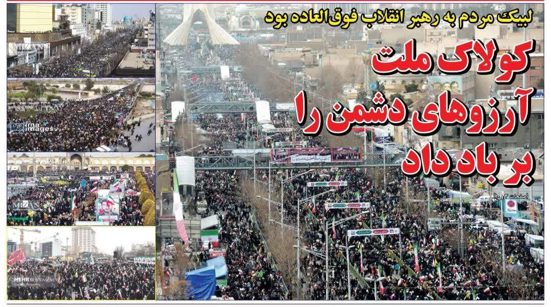دیروز ملت بزرگ ایران یک قیام تاریخی آفریدند. میلیونها نفر در سراسر کشور در سالروز پیروزی انقلاب اسلامی در حمایت از انقلاب اسلامی و رهبر معظم انقلاب به میدان آمدند، پرچمهای آمریکا را به آتش کشیدند و با شعار «مرگ بر آمریکا» و «مرگ بر اسرائیل» خط بطلانی بر هیمنه پوشالی مستکبران کشیدند.