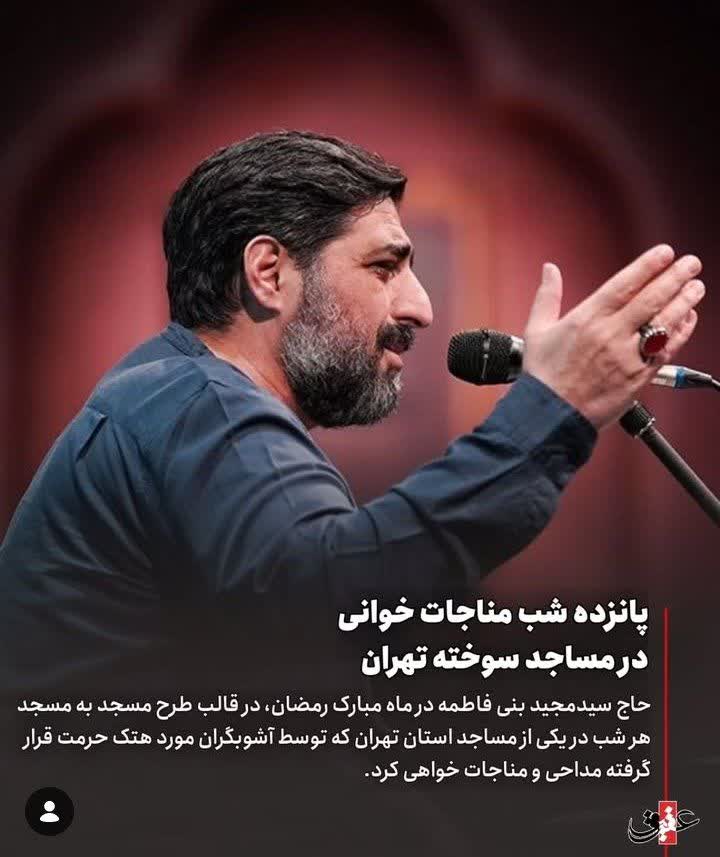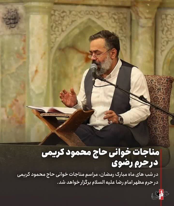 به گزارش شهدای ایران: در شبهای ماه مبارک رمضان، حاج محمود کریمی در حرم رضوی و سید مجید بنیفاطمه در مساجد سوخته تهران مناجاتخوانی خواهند کرد.