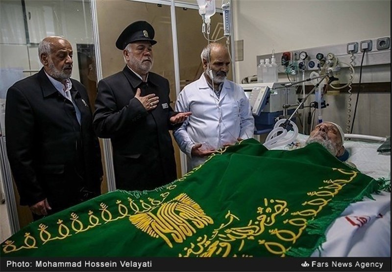 چهار تن از خادمان حرم ثامنالحجج امام علی بن موسی الرضا(ع) که در کاروان «زیر سایه خورشید» حضور داشتند پرچمی سبز رنگ از حرم این امام که منقش به آیه «نصر من الله و فتح قریب» بود را به عنوان تبرک با خود به همراه آورده بودند را باز کرده و روی بدن آیتالله مهدوی کنی انداختند تا ایشان نیز اکنون که در بستر بیماری قرار دارد عطر دل انگیز حرم رضوی را از نزدیک استشمام کند.