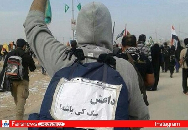 تصویر یکی از زائران اربعین که جمله «داعش سگ کی باشه» را روی کوله پشتیاش نوشته با مورد توجه کاربران قرار گرفته است.