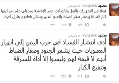 "مجتهد" افشاگر اسرار خاندان آل سعود فاش كرد كه گسترش فساد مالی در جريان حملات عربستان به يمن، باعث فروپاشی روحيه سربازان و افسران رده پايين ارتش شده است.