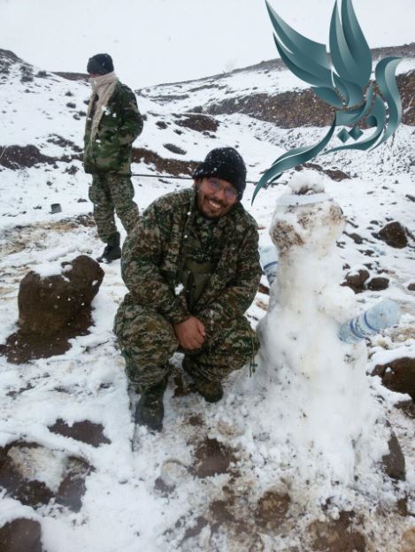 تصویر پیش رو مربوط به عکس یادگاری سردار رضا خاوری فرمانده ارشد لشکر فاطمیون در زمستان ۱۳۹۳ دیر العدس، ارتفاعات تل غشیم با یک آدم برفی ساخته شده توسط مدافعان می باشد.*اویس