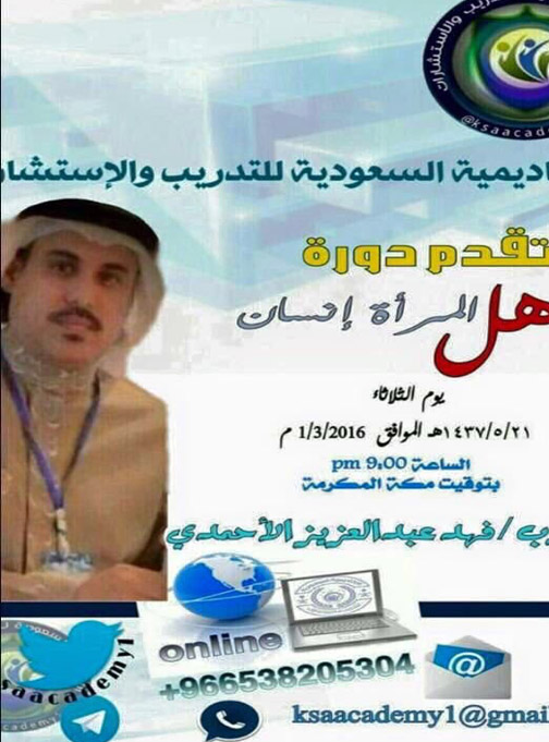 بنابر این گزارش، در آگهی مطبوعاتی که در رابطه با مکان و زمان برگزاری این دوره منتشر شده، شماره هایی برای تماس درج شده است. این در حالی است که عربستان سعودی تابع قوانین فرقه ضاله "وهابیت" بوده و قوانین انحرافی آن را در این کشور اجرا می کنند. طبق این قوانین زنان حق نشستن در کنار پدر، برادر، و محارم خویش را نداشته و در صورت نیاز به بیرون رفتن الزاما باید به همراه یکی از محارم ذکور خود اینکار را نجام دهد.