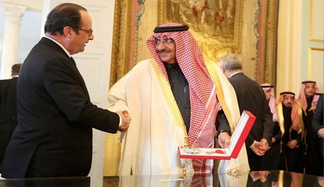 شبکه المنار امروز سه شنبه گزارش داد : فرانسوا اولاند رئیس جمهوری فرانسه در کاخ الیزه در پاریس پایتخت این کشور نشان افتخار را به محمد بن نایف داد.