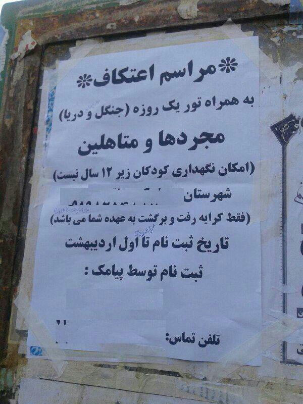 به تازگی تصویری از یک آگهی عجیب ثبت نام برای مراسم اعتکاف در فضای مجازی منتشر شده که محتوای آن با ذات این مراسم مذهبی مغایرت دارد و واکنش های زیادی را در پی داشته است.