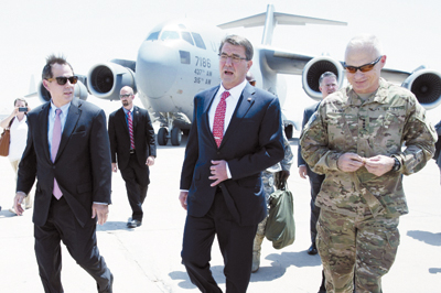 در آستانه شروع عمليات آزادسازي شهر موصل، وزير دفاع امريكا خود را به عراق رسانده است. اشتون كارتر، روز دوشنبه در ديدار با حيدر العبادي، نخست وزير و فرماندهان نظامي عراق از آمادگي واشنگتن براي كمك به عراق در عمليات آزادسازي موصل خبر داد و گفت كه مستشاران امريكايي حاضرند نيروهاي عراقي را در عمليات آزادسازي موصل همراهي كنند. به گزارش رويترز، كارتر به پايگاه القياره در جنوب موصل اشاره كرد كه روز شنبه از دست داعش آزاد شد و گفت: «بازپس‌گيري پايگاه هوايي القياره الغرب ادامه خواهد يافت. هدف از اين كار ايجاد يك مركز لجستيكي در آنجاست و امريكا از آنجا حمايت لجستيكي (براي آزاد‌سازي موصل) ارائه خواهد كرد.» وزير دفاع امريكا گفت: «اين پايگاه جديد به همراه پايگاه المخمور دو مركز لجستيك براي عمليات موصل هستند كه نيروهاي عراقي از جنوب و نيروهاي پيشمرگه از شمال با پشتيباني نيروهاي ما به موصل حمله خواهند كرد.» همچنين كارتر گفته است كه واشنگتن560 نيروي ديگر به عراق اعزام مي‌كند كه با احتساب اين نيروها تعداد نيروهاي امريكايي حاضر در عراق به 4هزار و 650 نفر مي‌رسد.