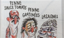 شارلیابدو به یکی از قربانیان که سر و صورتی خونآلود دارد، «پنه (نوعی پاستا) با سس گوجه فرهنگی» لقب داده و زنی که سر و صورتی کبود دارد را با اسم غذای «penne au gratin» مشخص میکند. عدهای از قربانیان که اجسادشان بین ساختمانها جا مانده و پاهایشان بیرون است به «لازانیا» تشبیه شدهآند.