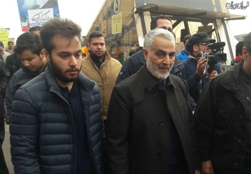 سرلشکر قاسم سلیمانی فرمانده نیروی قدس سپاه پاسداران انقلاب اسلامی امروز به جمع راهپیمایان تهرانی در مراسم گرامیداشت سیوهشتمین سالگرد پیروزی انقلاب اسلامی پیوست.