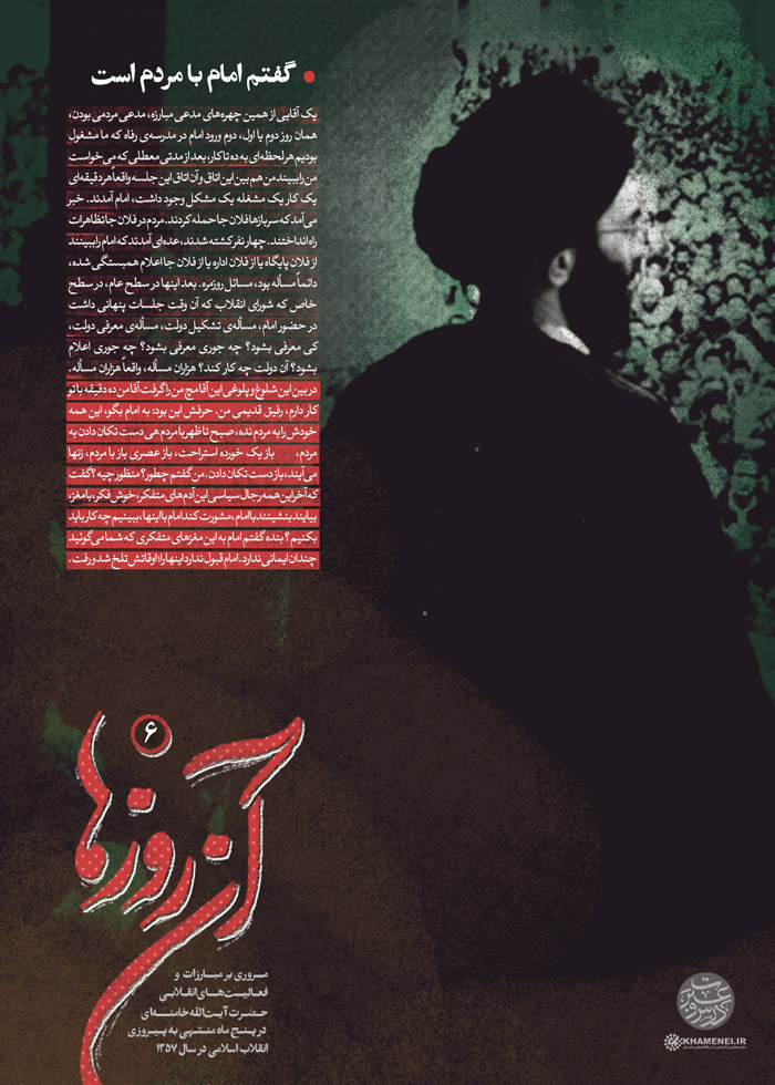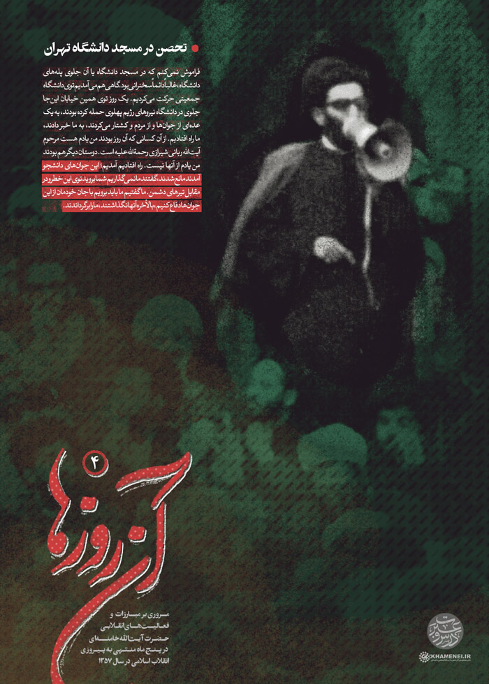 بخش «درس و عبرت» پایگاه اطلاعرسانی KHAMENEI.IR در آستانهی دههی فجر و خجسته ایام سالروز پیروزی انقلاب اسلامی مجموعه سخننگاشت «آن روزها» را که روایتی از دوران مبارزات آیتالله خامنهای در پنج ماه منتهی به پیروزی انقلاب است منتشر میکند.