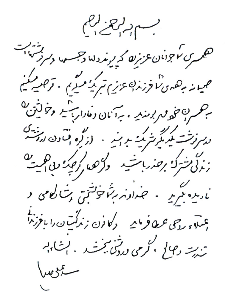 پايگاه اطلاعرساني khamenei.ir تصوير دستخط رهبر معظم انقلاب در توصيه به زوجهاي جوان و تبريک بهمناسبت ازدواج آنان را منتشر کرد.