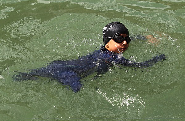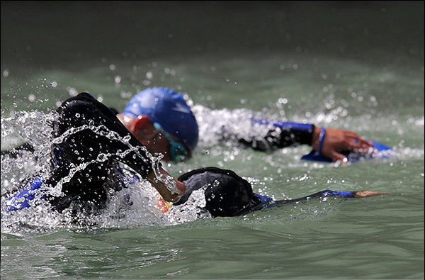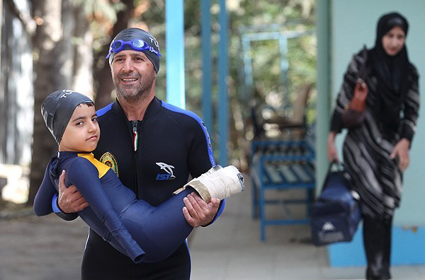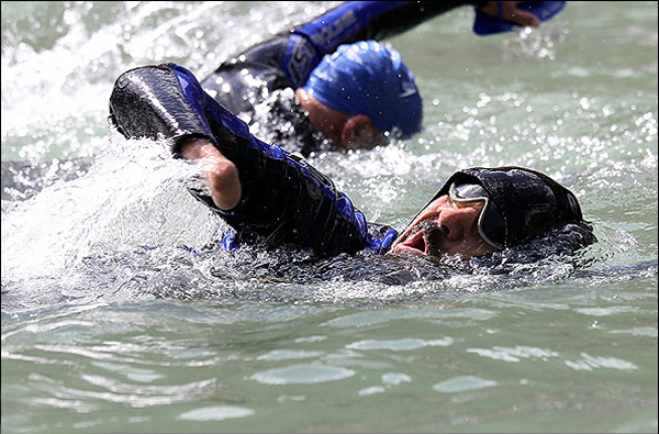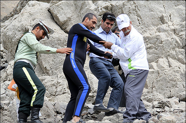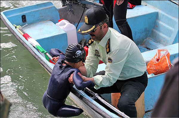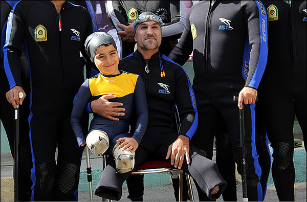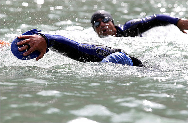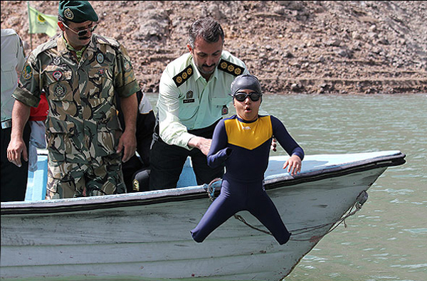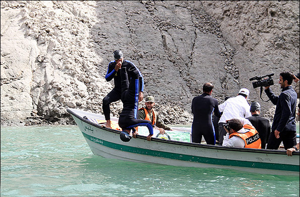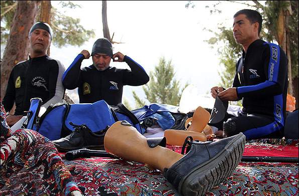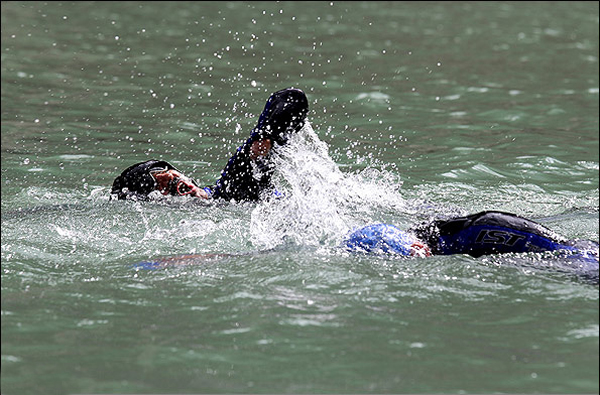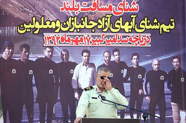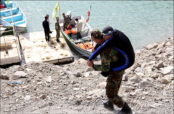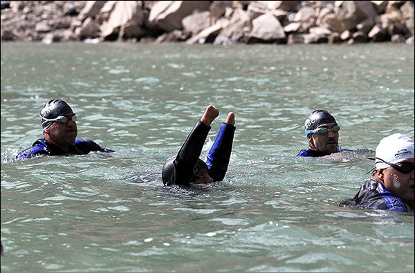 چند نفر از جانبازان نیروی انتظامی استان البرز در روز چهارشنبه به مناسبت هفته ناجا در سد امیر کبیر شنا کردند.