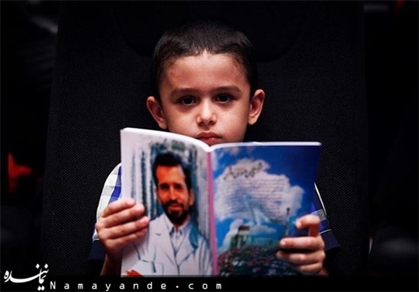 پسر شهید مصطفی احمدیروشن دفتری با عکس پدر شهیدش را در دست گرفته است.