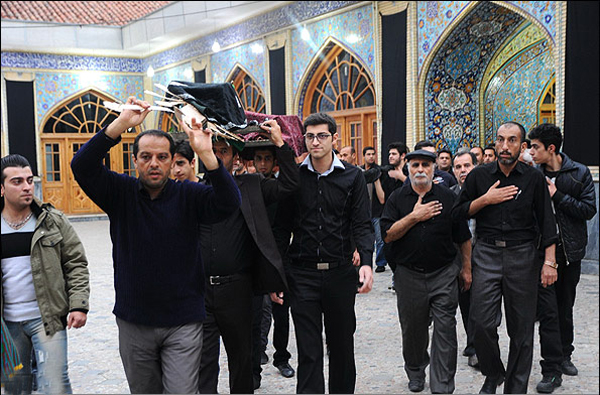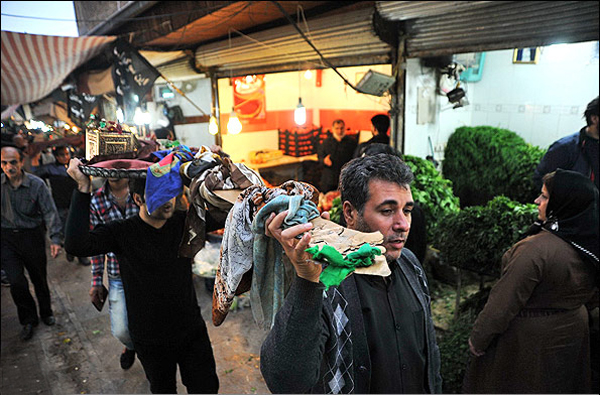 هر یك را در یك سینی گذاشته و بالای دست قرارداده و به صورت دسته و ذكر نوحه و مصیبت و صلوات بر سر درب