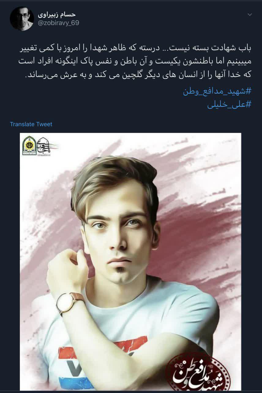 یکی از کاربران توییتر در صفحه شخصی خود به تصویری از شهید مدافع وطن «علی خلیلی» که بیست و ششم خرداد 99 در مرز بانه بر اثر درگیری با قاچاقچیان مسلح به درجه رفیع شهادت نائل گردید اشاره ای داشته است.