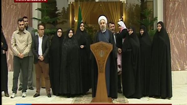 شهدای ایران: خانواده شهدای هسته ای در زمان نشست خبری حسن روحانی درباره توافق هسته ای در محل نشست خبری و در کنار رئیس جمهور حاضر شدند.