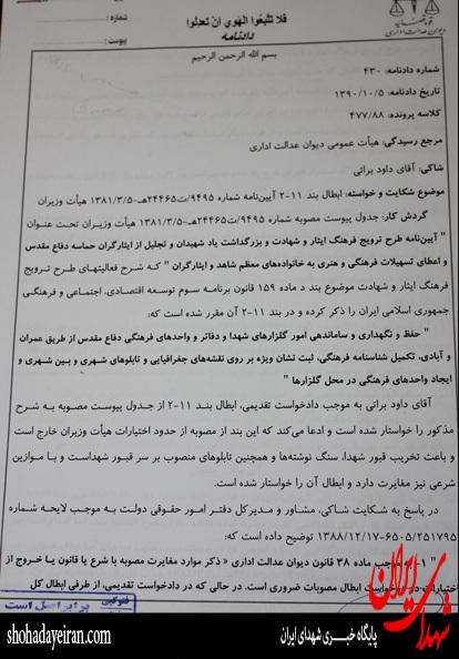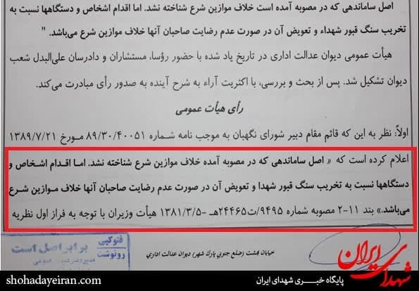 در متن حکم دیوان عدالت اداری آمده است: هر گونه دست زدن به قبور شهدا بدون اخذ رضایت از خانواده های شهدا خلاف موازین شرع و قانون است و با متخلفان برخورد صورت می پذیرد. این در حالی است که هز قبر شهید در حال حاضر بعد از فوت پدر و مادر شهدا بیش از 5 وارث دارد و باید همگی رضایت نامه رسمی به این امربدهند.