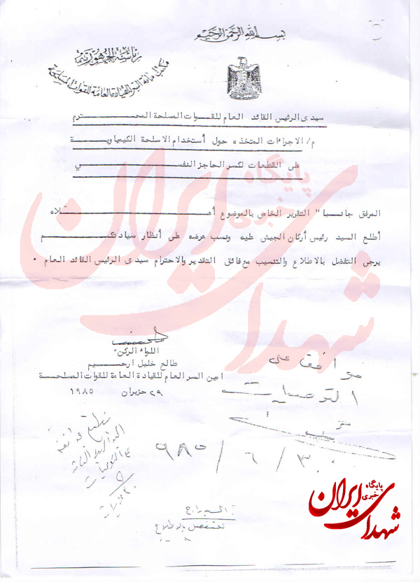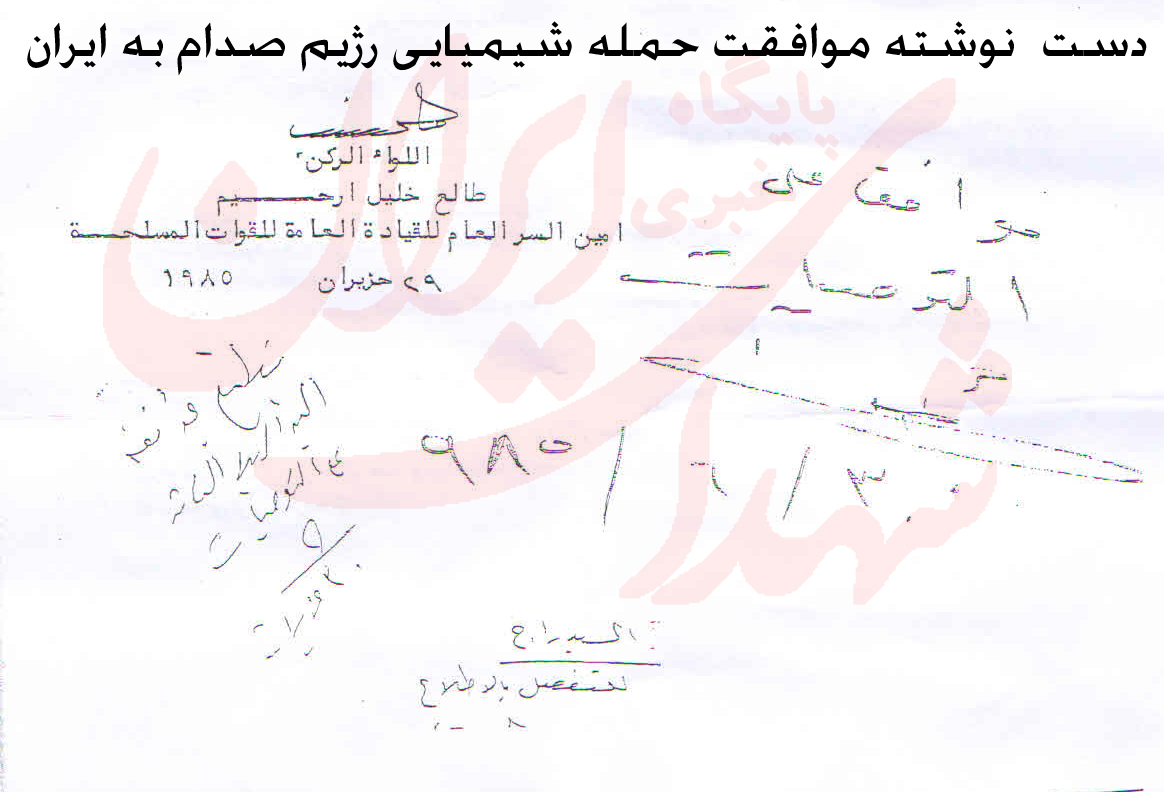 سند زیر یکی از اسناد محرمانه عراق است که دست نوشته صدام جهت موافقت با به کارگیری سلاح های شیمایی علیه ایران در آن موجود می باشد.