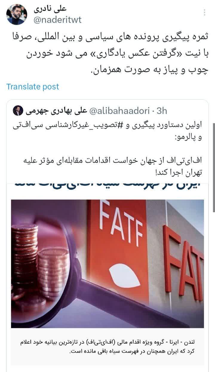به گزارش شهدای ایران : علی نادری فعال رسانه ای در صفحه شخصی خود در ایکس نوشت: ثمره پیگیری پرونده های سیاسی و بین المللی، صرفا با نیت «گرفتن عکس یادگاری» می شود خوردن چوب و پیاز به صورت همزمان.
