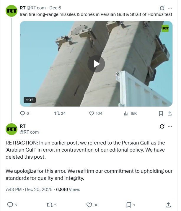 به گزارش شهدای ایران: شبکه راشاتودی که در مطلب چند روز قبل خود از عبارت جعلی به جای «خلیج فارس» استفاده کرده بود، عذرخواهی و مطلب خود را حذف و اصلاح کرد.