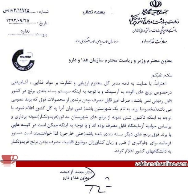مضاف بر اینکه، تایید نامه معاون غذا و داروی دانشگاه علوم پزشکی مازندران و ارسال این نامه توسط سازمان غذا و دارو به تمام دانشگاههای علوم پزشکی سراسر کشور، نشان می دهد موضوع آلوده بودن حداقل یکی از برنج های اعلام شده با شبهات فراوانی همراه است و به نوعی با نامه مذکور و تایید سلامت برنج های فریدونکنار، لیست 7 گانه، کمی آب رفته است.