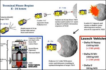 انفجار بمب درون این گودال تاثیر آن را 20 برابر می کند. بمب هسته ای یک میلی ثانیه بعد منفجر می شود و محققان امیدوارند بتوانند سیارک را متلاشی کند. هر ماموریت 500 میلیون دلار هزینه بر می دارد.