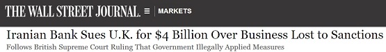 در مطلبی اقتصادی، روزنامه «وال استریت ژورنال» از شکایت یک بانک ایرانی از دولت انگلیس به دلیل تحریم های غیرقانونی اعمال شده علیه خود خبر داده است. به نوشته این روزنامه، بانک ملت ضمن شکایت از وزارت خزانه داری انگلیس به واسطه ضرر و زیانی که تحریم های این کشور علیه ایران متوجه این بانک کرده، از دولت انگلیس درخواست غرامت 4 میلیارد دلاری کرده است. این شکایت پس از آن مطرح می شود که در ژوئن 2013، دادگاه عالی انگلیس ضمن صدور رأی به نفع بانک ملت، تحریم های وضع شده از سوی دولت انگلیس علیه این بانک را غیرقانونی خواند و اعلام کرد از آنجا که بانک ملت یک بانک دولتی نیست و ارتباطی نیز با برنامه هسته ای ایران ندارد، این تحریم ها قانونی نبوده است.