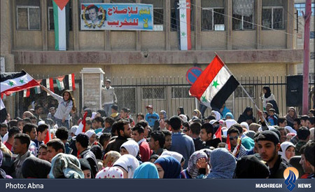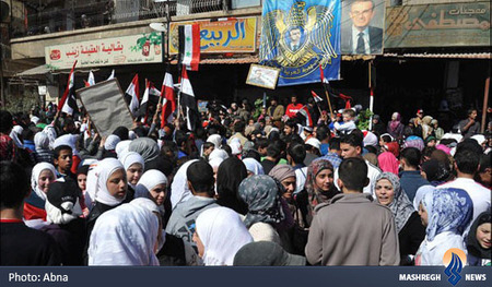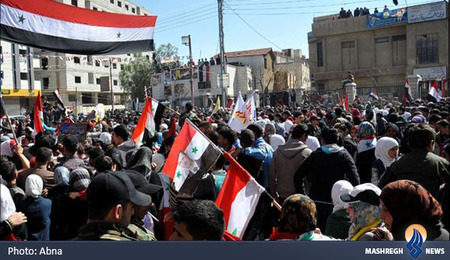 شرکت کنندگان در این تظاهرات بر وحدت مردم سوریه در مقابل تروریست ها و ایستادگی تا نابودی آنها تاکید کردند.