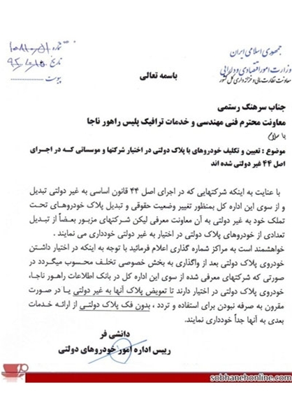 بر اساس نامه خزانه داری کل کشور به مسئولان پلیس راهور ناجا که صبحانه به نسخه ای از آن دست پیدا کرده است با اشاره به واگذاری برخی شرکتهای دولتی در راستای اصل 44 قانون اساسی به بخش غیر دولتی، برخی شرکتهای مزبور از تبدیل خودروهای پلاک دولتی به غیردولتی خودداری کرده اند.