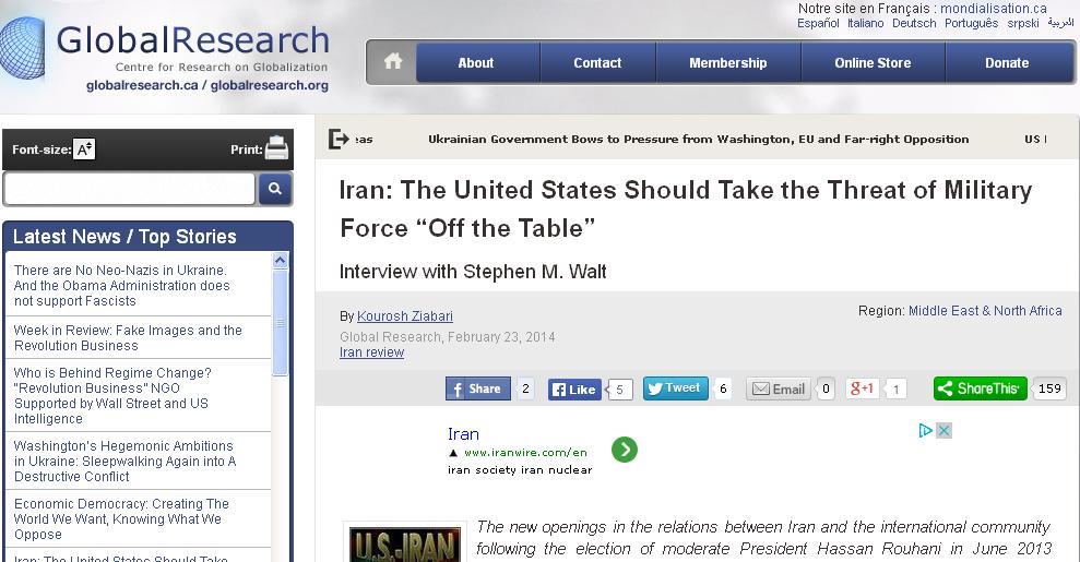 گلوبال ریسرچ، این موارد را در گفتگویی با پرفسور استفان والت، تحلیلگر مشهور مسائل خاورمیانه، مطرح کرده و از وی می پرسد: آیا گشایش اخیر دیپلماتیک در روابط دوجانبه ایران و آمریکا در تناقض با تهدیدات جنگی اوباما علیه این تهران نیست؟