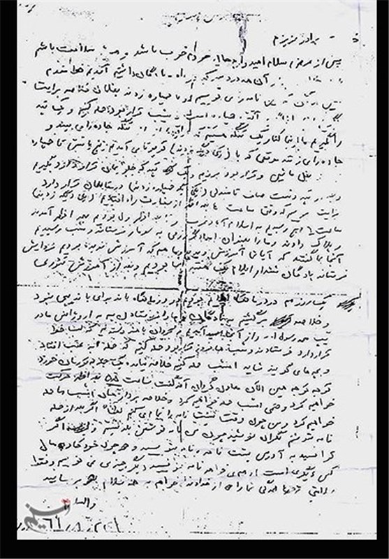 پس از عرض سلام، امیدوارم حال خودم خوب باشد و همیشه سلامت باشم. بعد از آن همه درد سر که در راه پادگان داشتیم، آمدیم خط مقدم. همین الان که این نامه را می نویسم، دو تا خمپاره زدند بغلمان. خلاصه برایت بگویم. آتش خمپاره است. دیشب قرار بود حمله کنیم و یک تپه را بگیریم. ما این جا کنار یک تنگه هستیم که عراقی ها از آن تنگه جاده را میبینند و جاده را می زنند، موقعی که با(یکی دیگه زدند) تویوتا می آمدیم، پنج یا شش تا خمپاره زدند بغل ماشین و قرار بود برویم و یک تپه که جلویمان قرار دارد، بگیریم. و بعد از تپه، دشت صاف تا مندلی(یکی دیگر خمپاره زدند) در مقابلمان قرار دارد. برایت بنویسم که وقتی ساعت 4 بعد از ظهر از سفارت راه افتادیم (یکی دیگه زدند) ساعت 6 صبح، رسیدیم به اسلام آباد غرب و تا بعد از ظهر ول بودیم. بعد از ظهر آمدند و پلاک دادند و ما را به عنوان امدادگر رزمی به سومار فرستادند و شب رسیدیم آنجا. به ما گفتند که آیا شما آموزش دیدید. و ما هم که آموزش ندیده بودیم فردایش فرستادند پادگان ششدار ایلام. یک هفته آنجا بودیم و بعد از آموزش تئوری، یک روز هم در درمانگاه ایلام بودیم. در درمانگاه، باند برای باندپیچی نبود و خلاصه برگشتیم به پادگان و ما را فرستادند به اورژانس مادر تیپ محمدرسول الله(صلوات الله علیه) و از آنجا آمدیم به گردان باهنر، دسته 3 که لب خط قرار دارد فرستادند و شب همانروز قرار بود حمله کنیم که حمله به عقب افتاد و بچه می گویند شاید امشب حمله کنیم. خلاصه نیامده یک حمله به تورمان خورد. توجه توجه. همین الان معاون گردان آمد گفت ساعت 5/5 بعد از ظهر حرکت خواهیم کرد و حتمی امشب حمله خواهیم کرد و خلاصه برادر جان. امشب ما حمله خواهیم کرد و من چون وقت نیست، نامه را تمام می کنم. لطفا اگر بعد از حمله نامه ننوشتم، نگران نوشید چون من نامه نوشتن بلد نیستم و اگر توانستید به آدرس پشت نامه، نامه بنویسید و چون خودکار مال کس دیگری است، او هم می خواهد نامه بنویسد، دیگر چیزی نمی نویسم و فقط سلامتی همگی شما را از خداوند، خواهم. به همه سلام برسانید